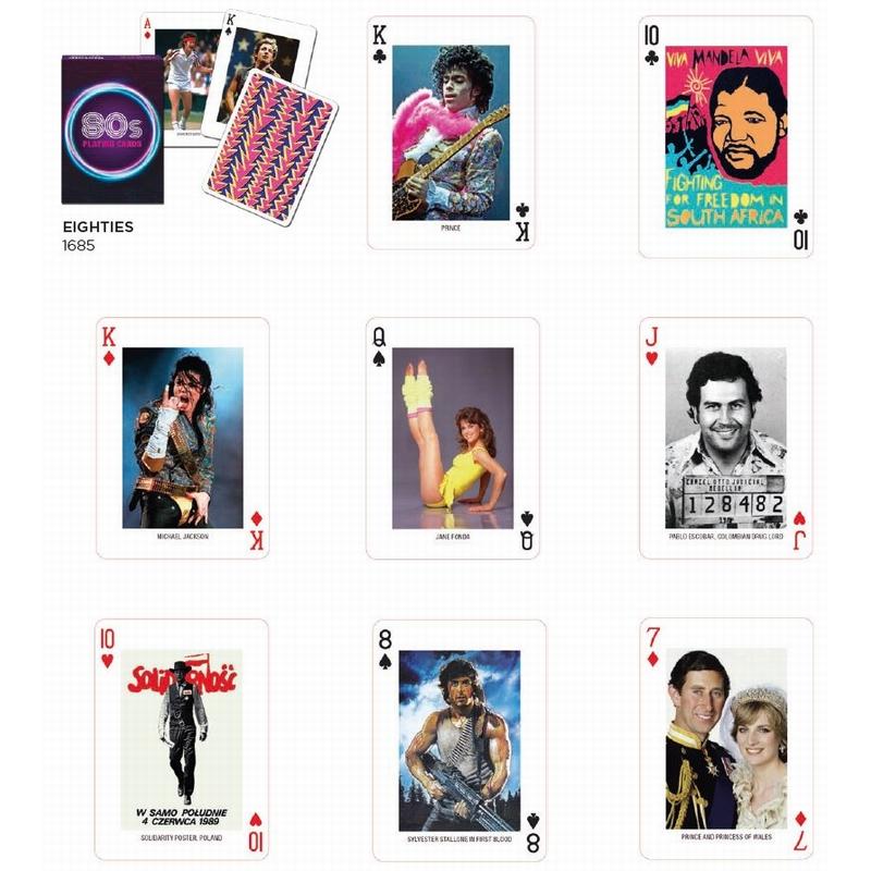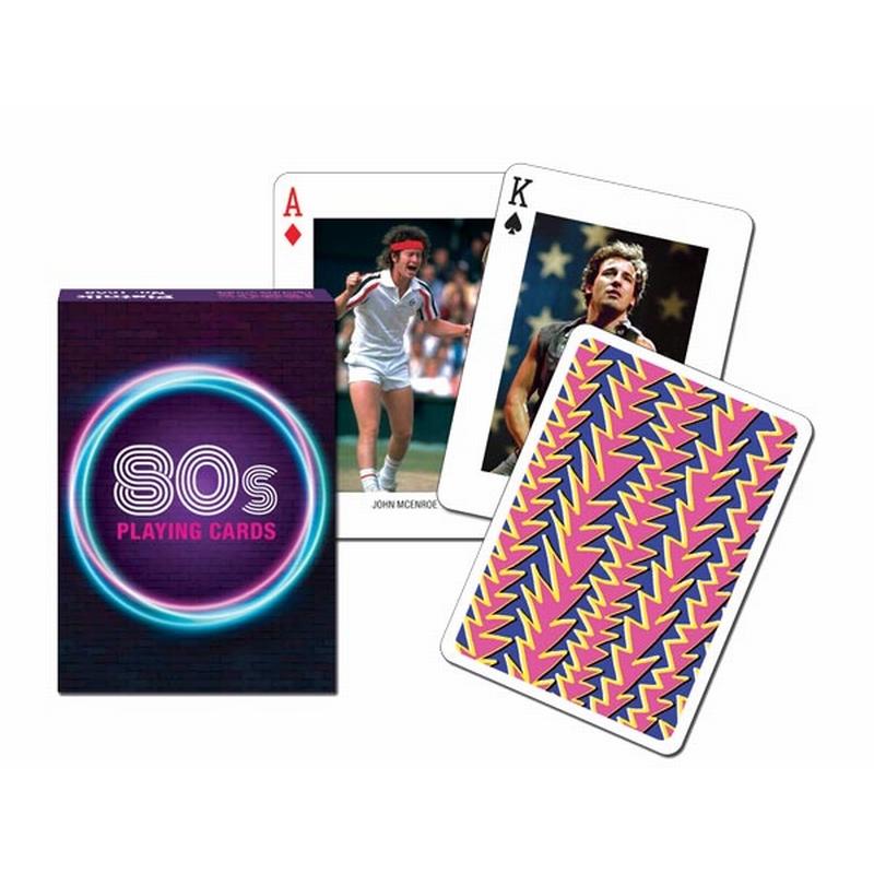Jeu de 55 cartes thématiques. Chaque carte est ornée d'un visuel différent: photos, affiches, couvertures d'ouvrages et célébrités emblématiques des années 80 ! Ce jeu peut être utilisé pour tous les jeux de cartes. Fondée en 1824 à Vienne, Piatnik fabrique toujours ses jeux en Autriche, dans le respect de normes strictes de qualité et d'environnement.