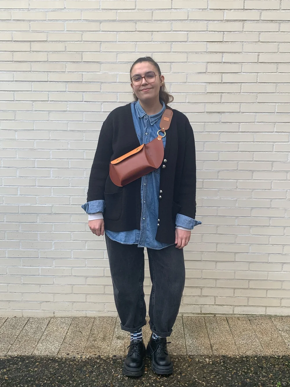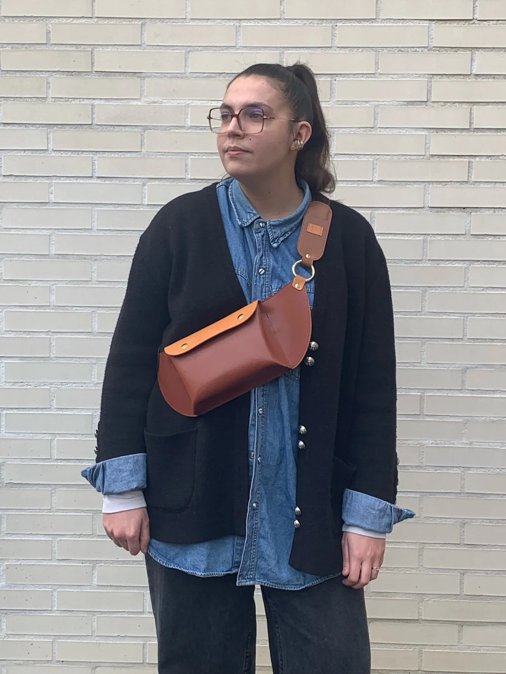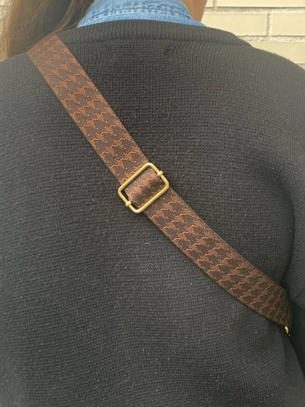 Cuirs de pommes terre, fauve et terre cuite (60% recyclé). Sangle pied de poule marron et noire. Boucle en laiton doré, vintage. Fermoirs magnétiques, anneau mousqueton et rivets en laiton, coloris or, fabriqués en Italie. Teinture de tranche Made in France à base d'eau.