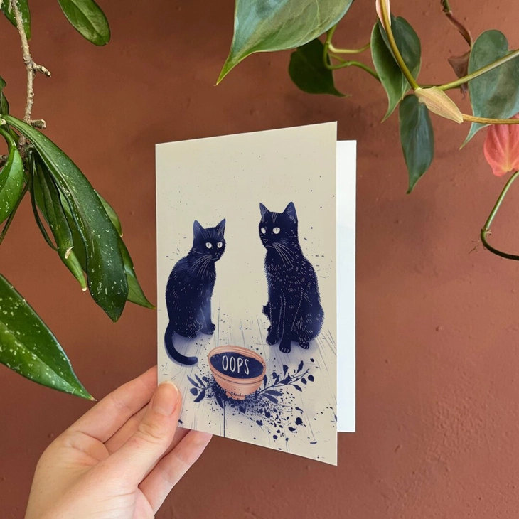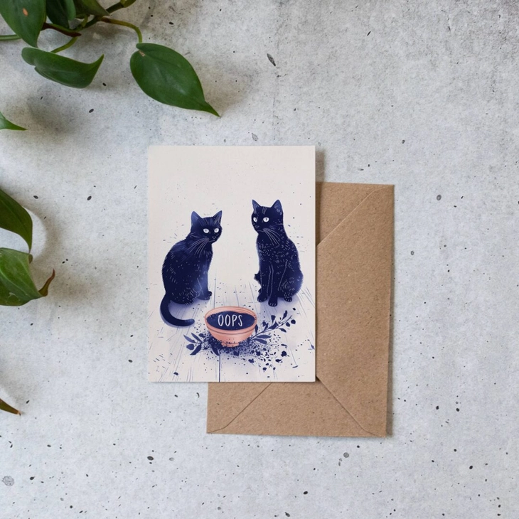 Cette charmante carte "Je suis désolé" et d’encouragement, intitulée "Oops - Accident de chats coquins", présente une illustration adorable de deux chats coupables ayant renversé un pot de plante. Le texte "Oops" capte avec humour l’incident. Parfaite pour s’excuser ou encourager après un petit accident, cette carte combine légèreté et sincérité, idéale pour apporter un sourire et montrer de l’empathie. C’est une façon attentionnée de reconnaître une erreur et d’exprimer vos excuses ou votre soutien avec gaieté et tendresse.