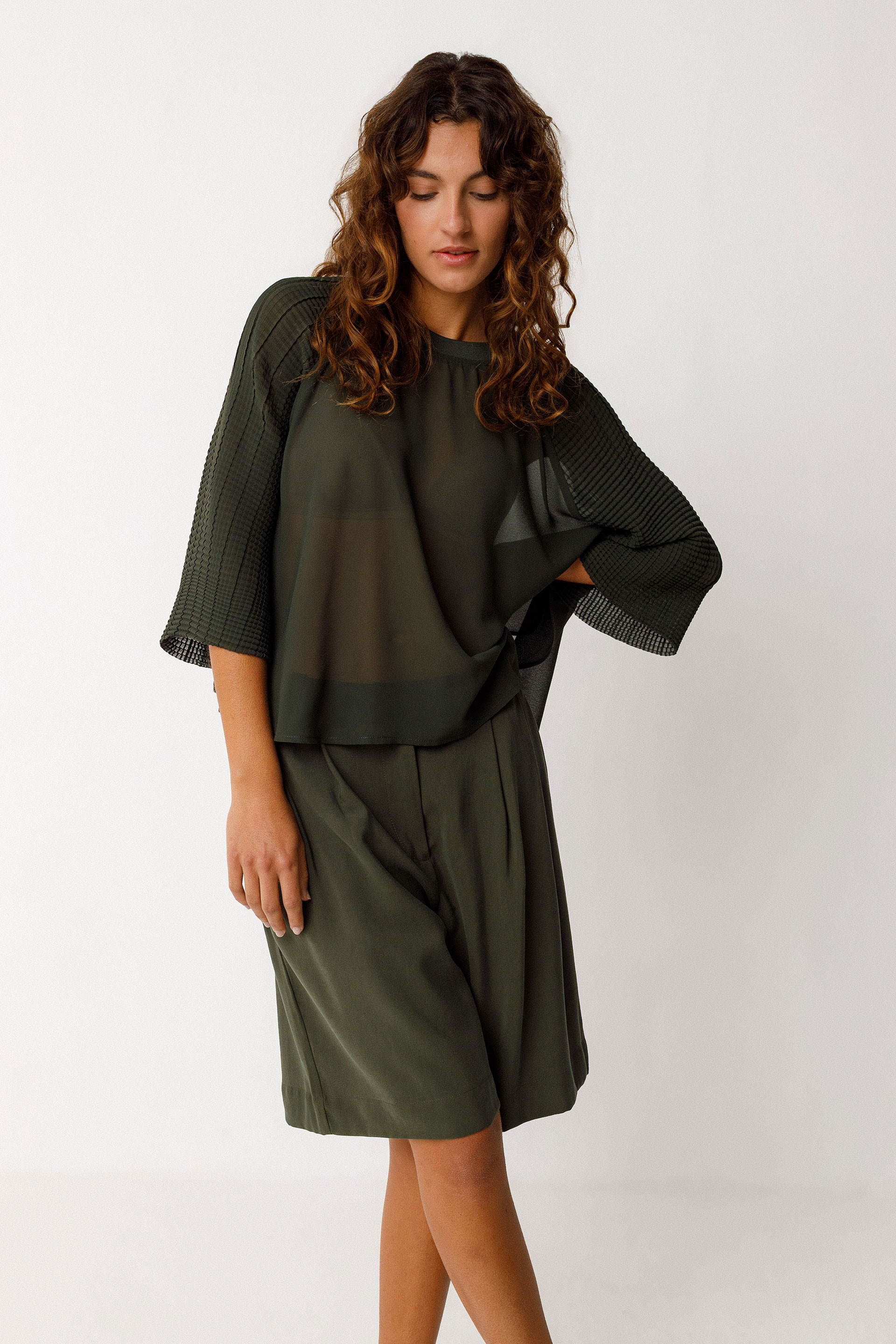 Chemise en forme de demi-cercle, avec un col rond côtelé et des manches 3/4 dans une matière contrastante.