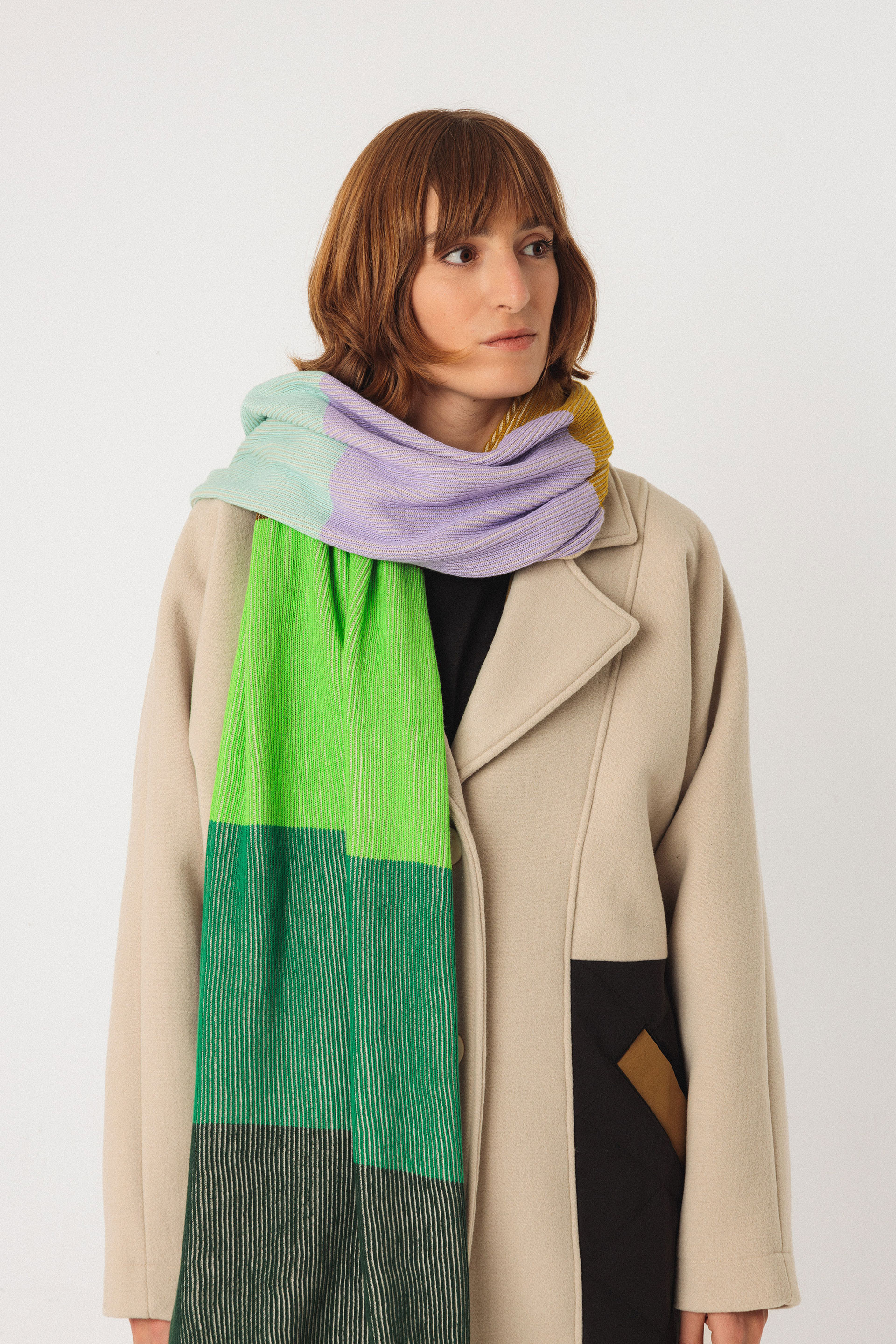 Écharpe rectangulaire multicolore en maille de coton biologique certifié GOTS.