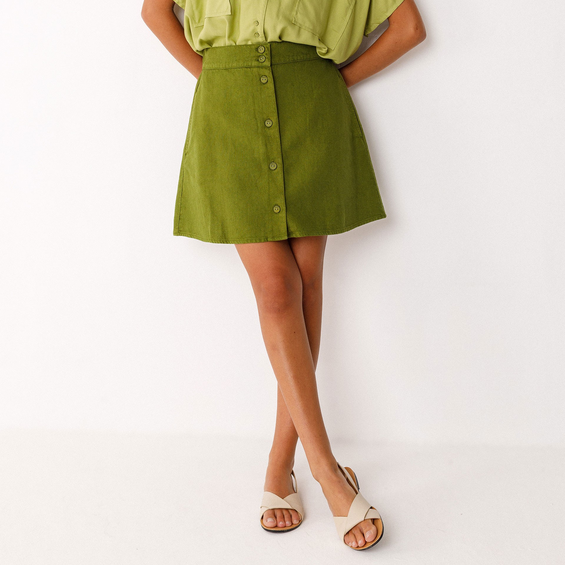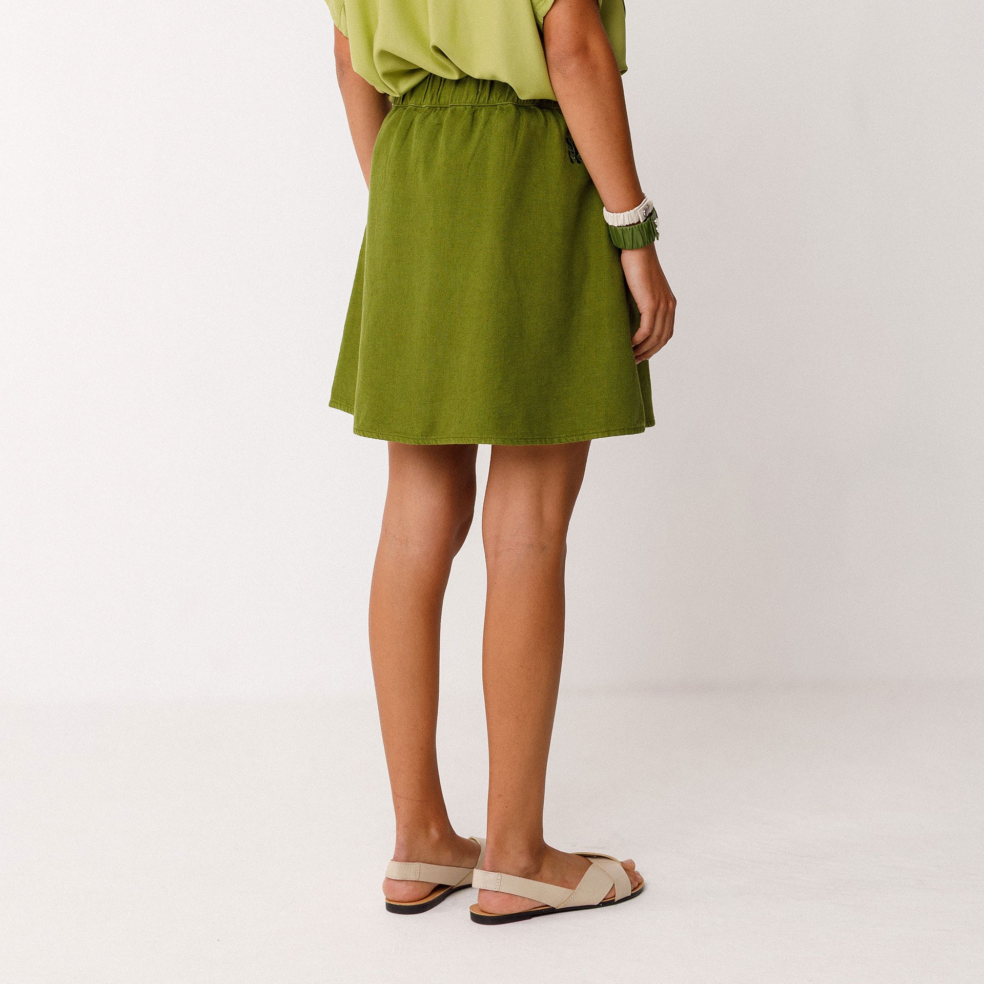Mini-jupe évasée en lin et coton bio avec taille élastiquée au dos et fermeture boutonnée devant.