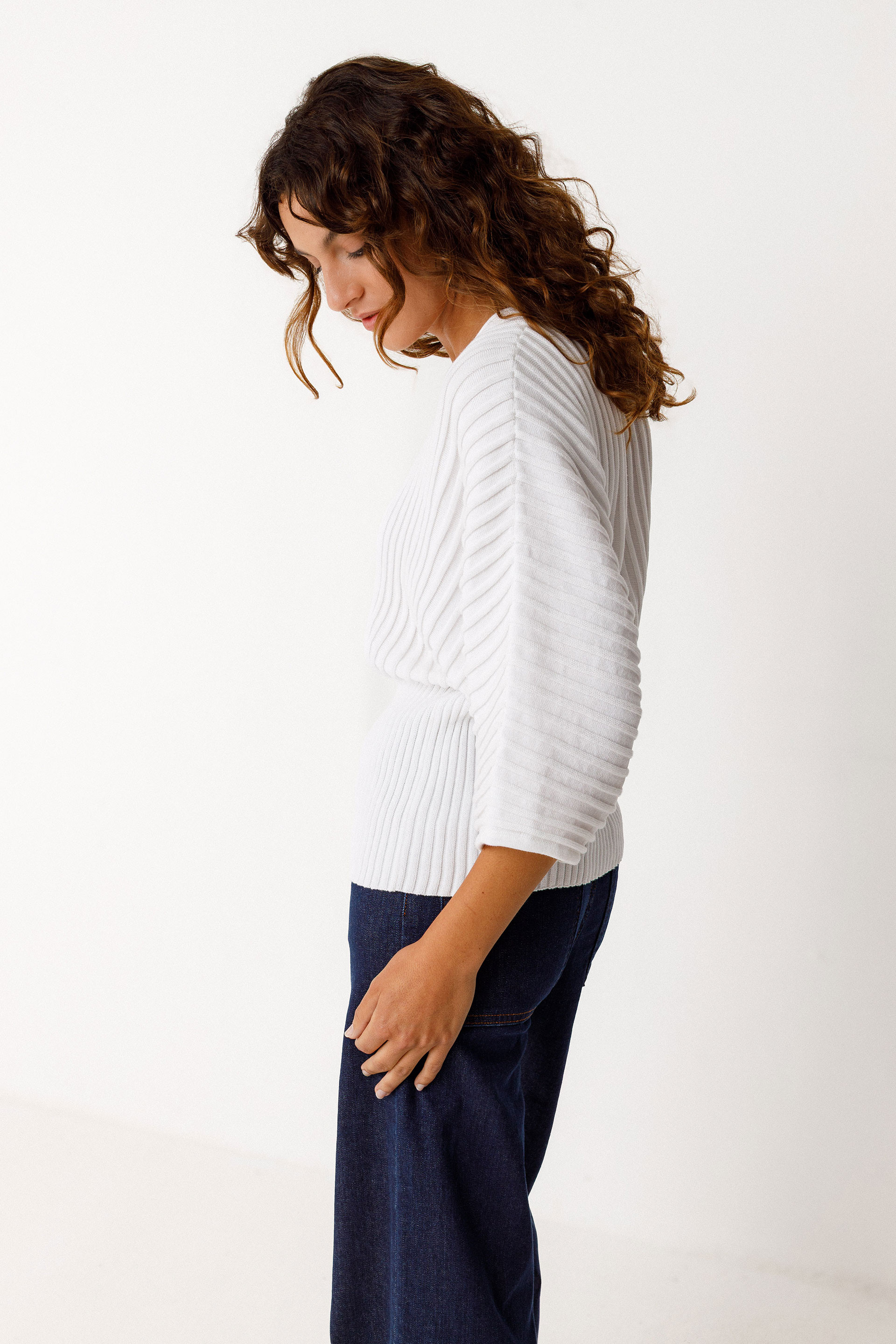 Pull à manches chauve-souris 3/4 et décolleté arrondis en maille côtelée légère de coton biologique certifié GOTS.