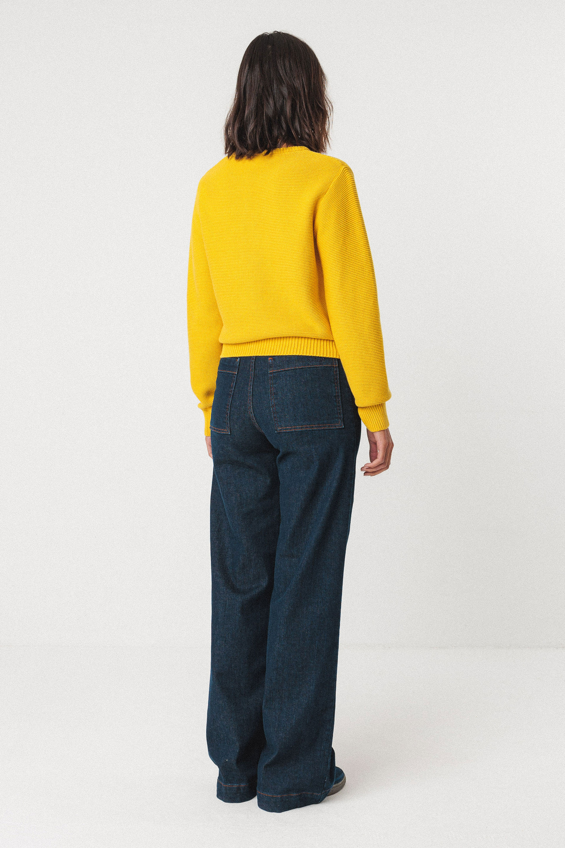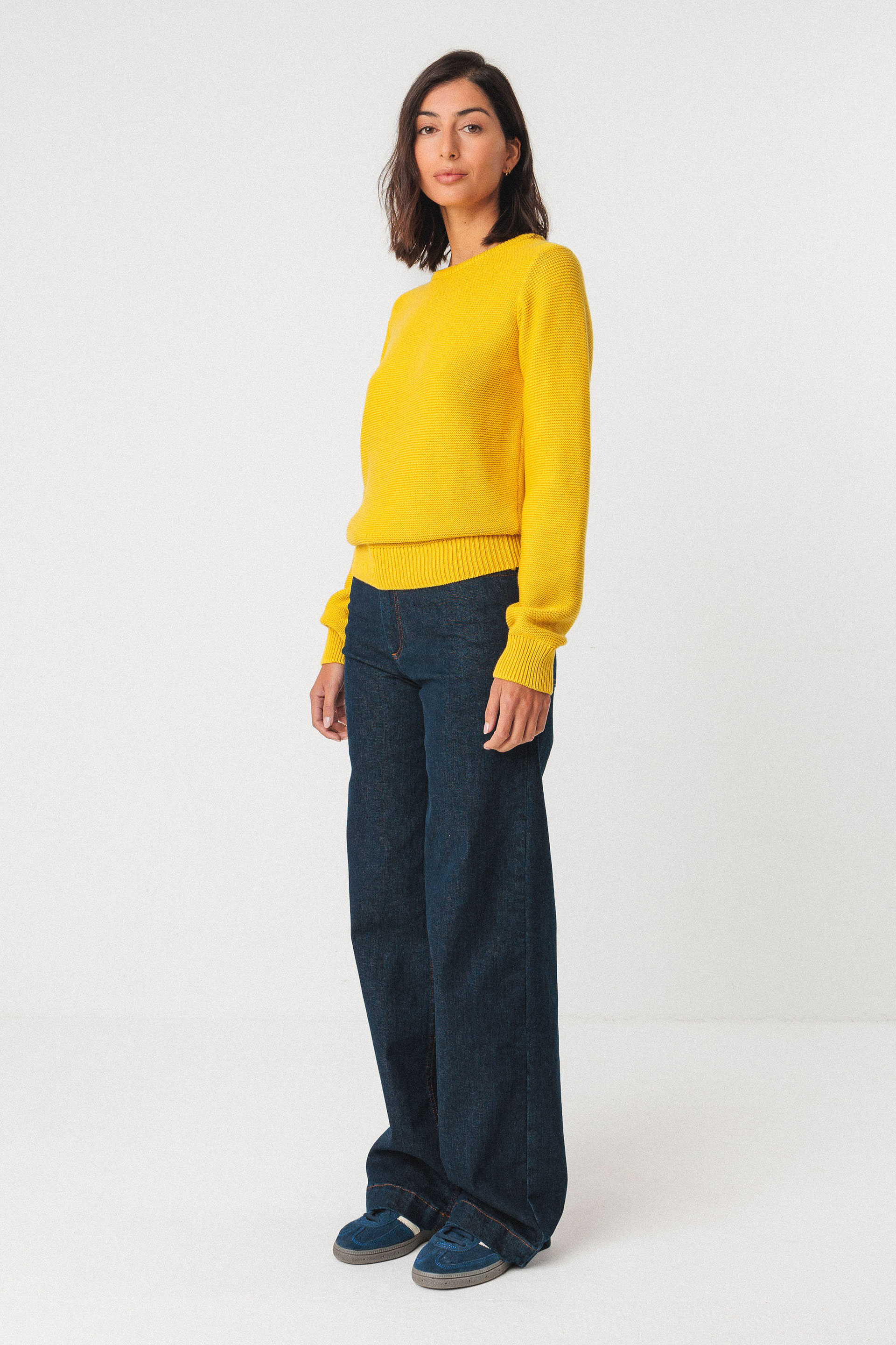Pull en tricot de coton biologique certifié GOTS avec un col rond, des manches longues et des finitions en tricot à côtes au col, à la taille et aux poignets.