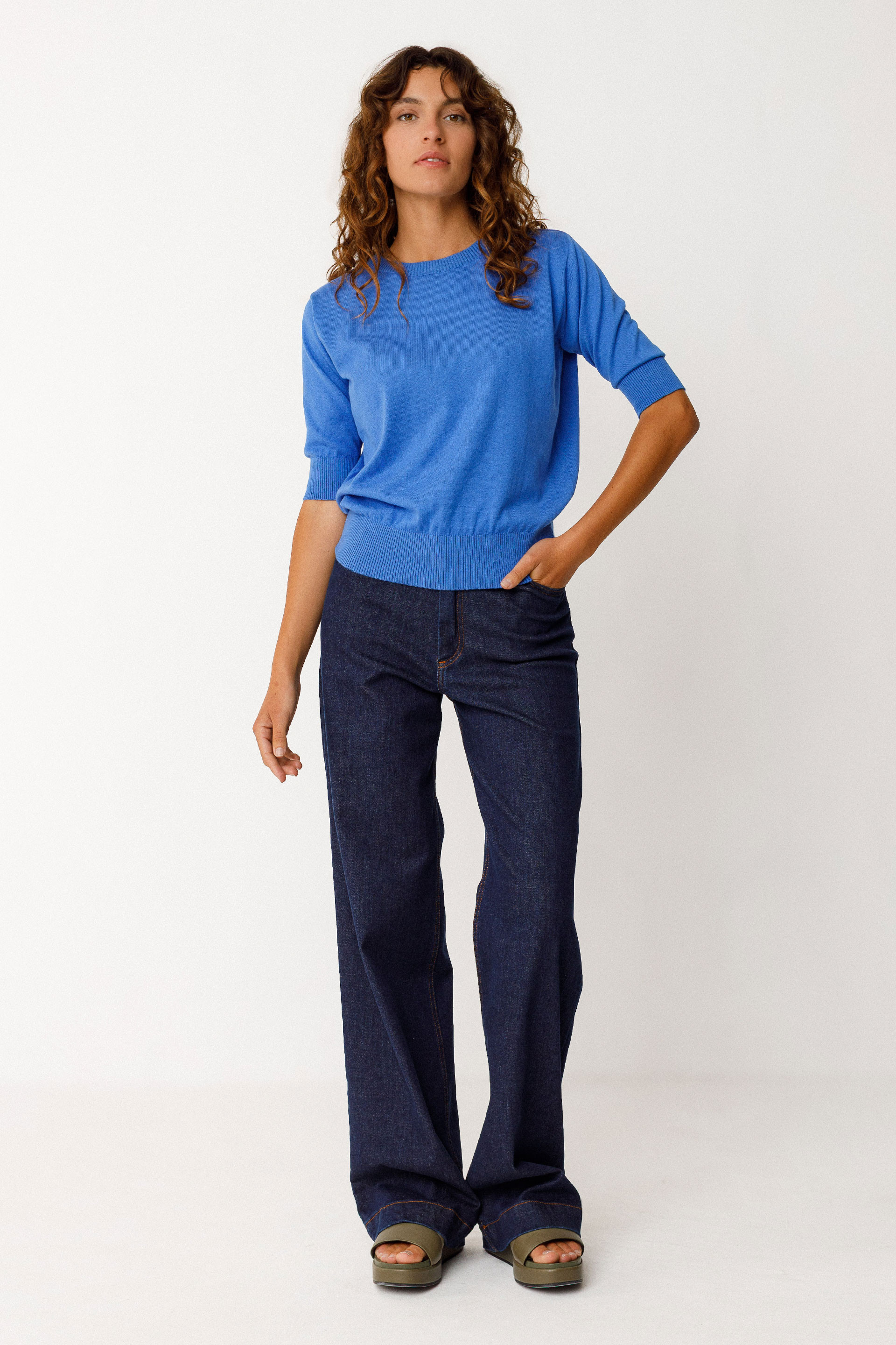 Pull bicolore à effet de texture, confectionné en maille légère de coton biologique certifié GOTS. Il affiche un col rond, des manches 3/4 et des finitions côtelées au col, en bas de manche et à la taille.