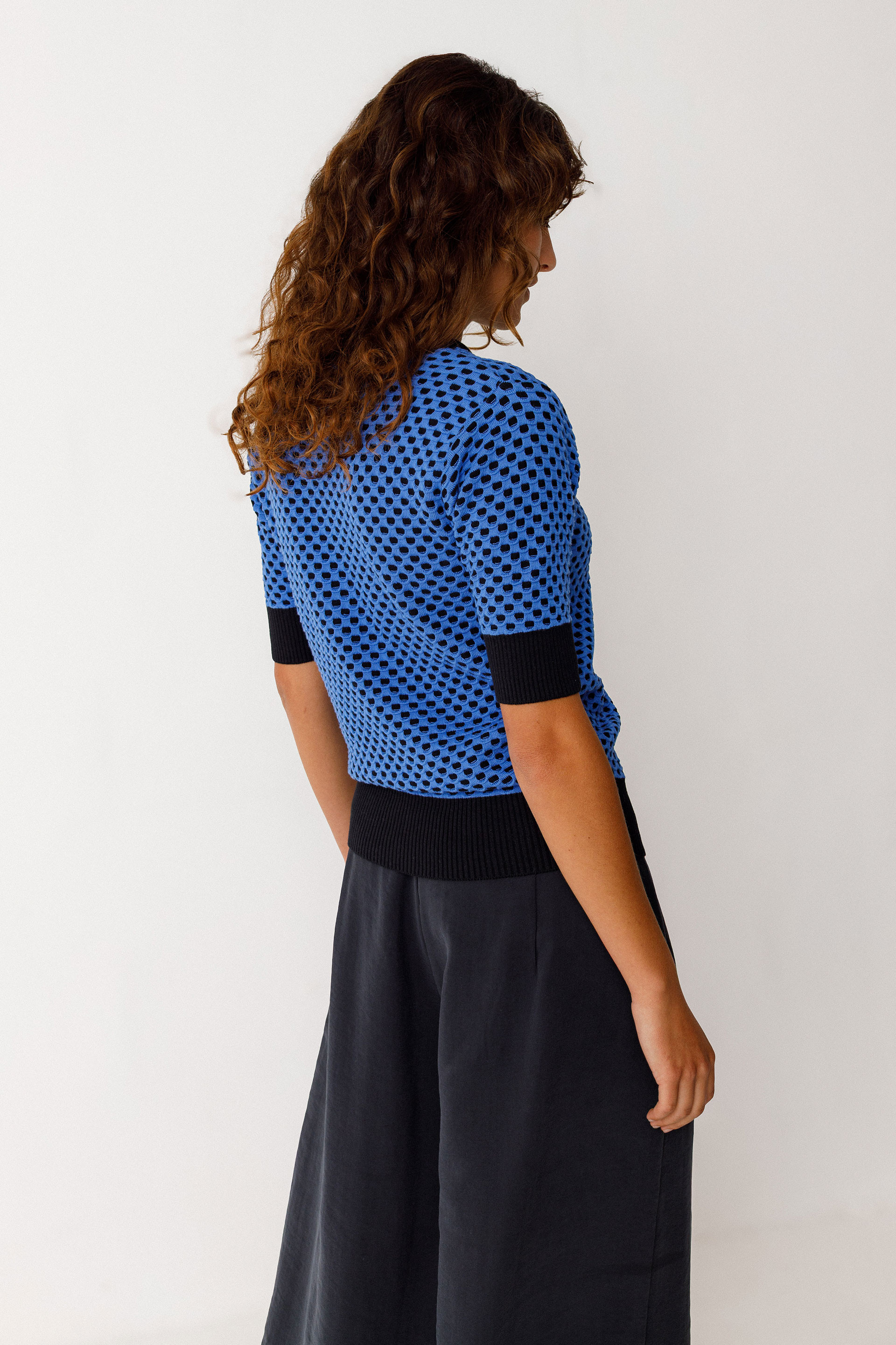 Pull MUIKE-GOTS bleu texturé pois vert bouteille