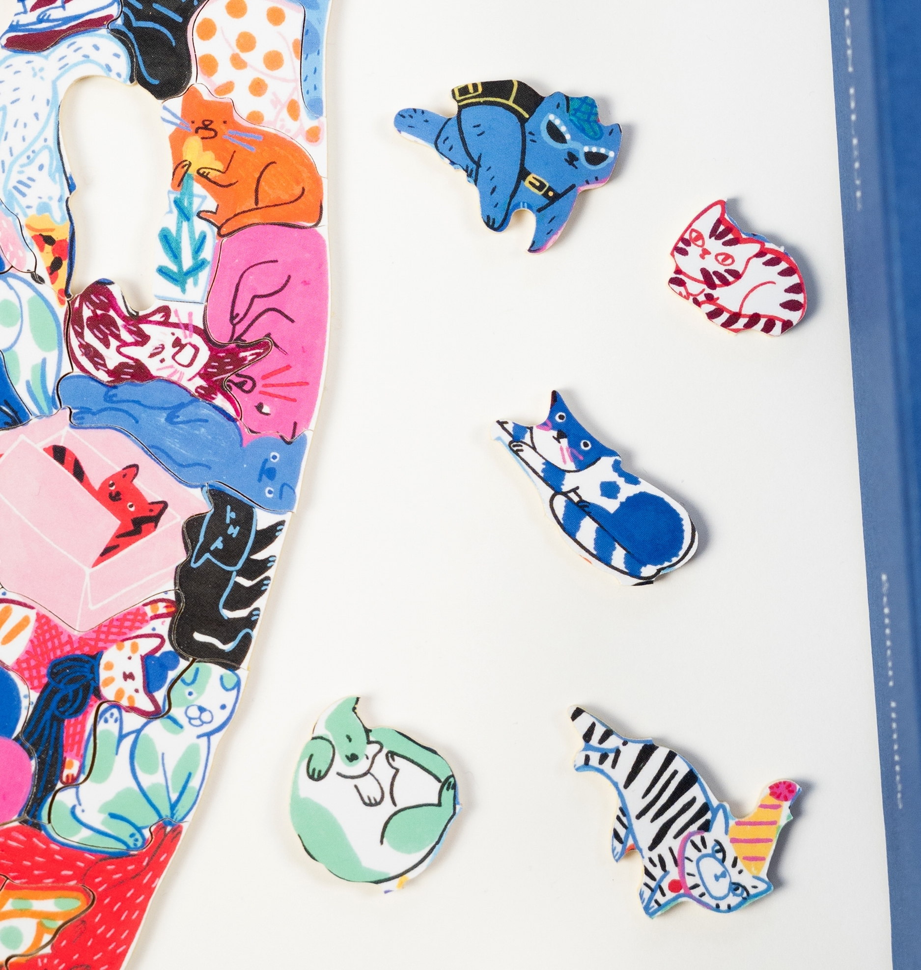 Inspiré de nos puzzles emblématiques "Les Animaux en Folie", où chaque animal forme une pièce unique, ce puzzle comprend environ 200 pièces représentant autant de chats ! Qu'ils soient musiciens, joueurs ou gourmands, Camille de Cussac a su donner à chacun une personnalité bien à lui. L'artiste française, qui vit et travaille à Paris, déploie une palette de couleurs éclatantes pour créer des scènes loufoques peuplées de personnages pleins de vie. Ce puzzle adopte la forme d'une silhouette de chat : pensez à l'assembler sur une surface stable et antidérapante pour plus de confort !