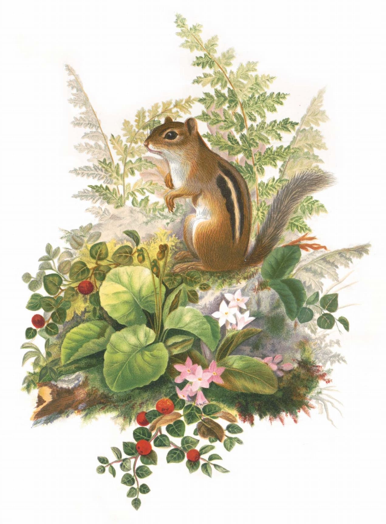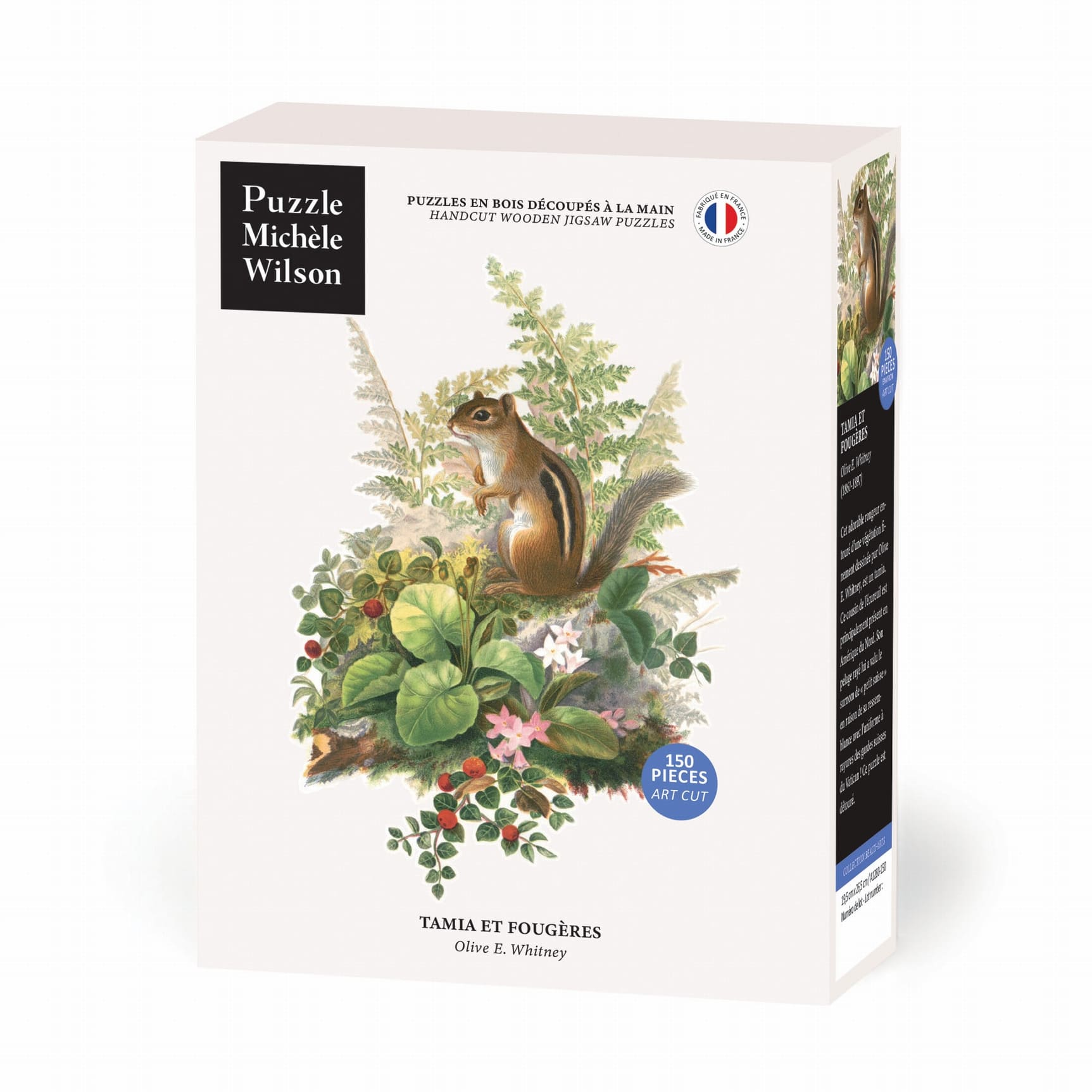 Olive E. Whitney, une artiste américaine du 19e siècle. Cet adorable rongeur, entouré d'une végétation finement dessinée, est un tamia. Ce petit mammifère, cousin des écureuils, est principalement présent en Amérique du Nord. Son pelage rayé lui a valu le surnom de "petit suisse", en raison de sa ressemblance avec l'uniforme à rayures des gardes suisses du Vatican ! Ce puzzle détouré suit les contours de l'image.