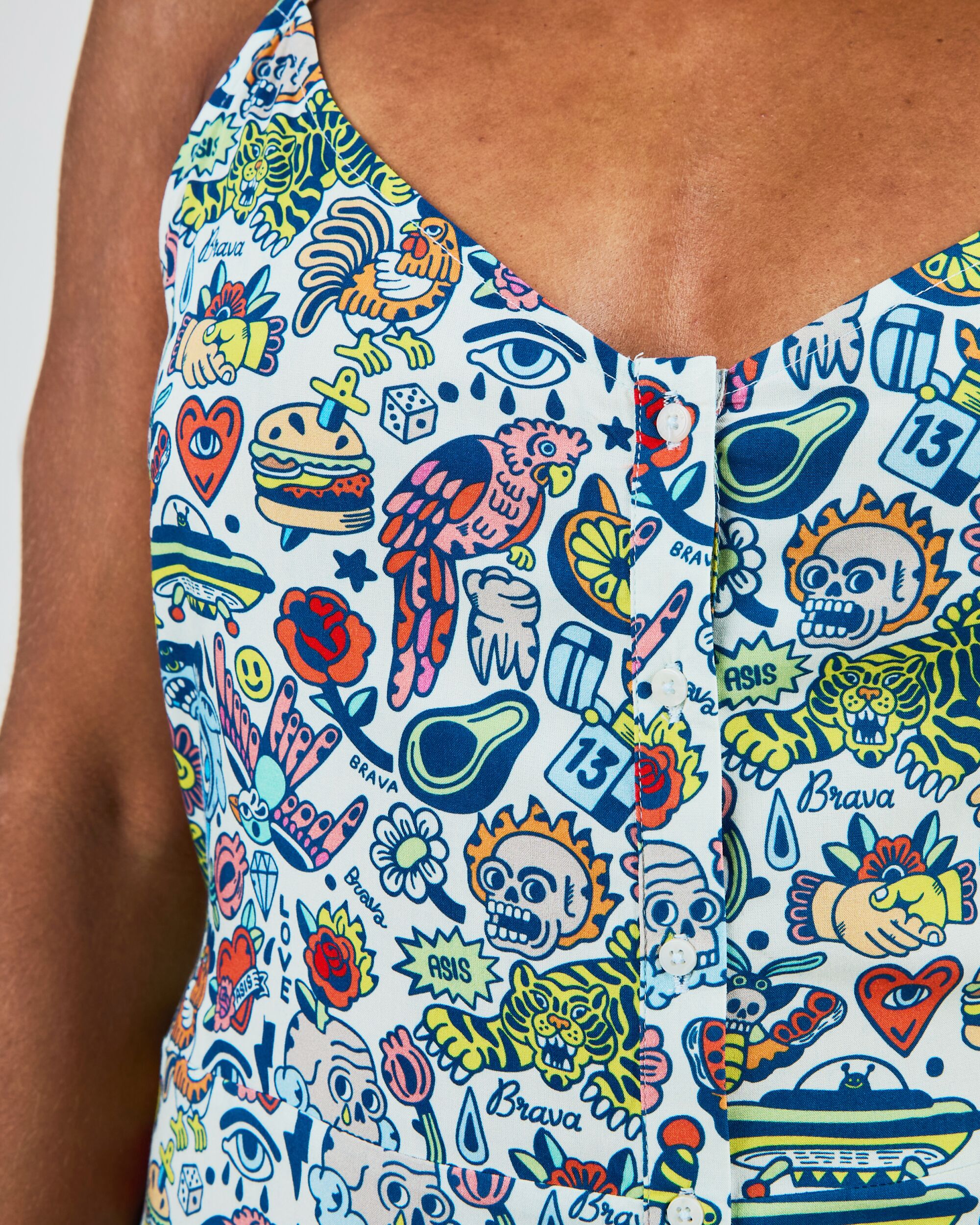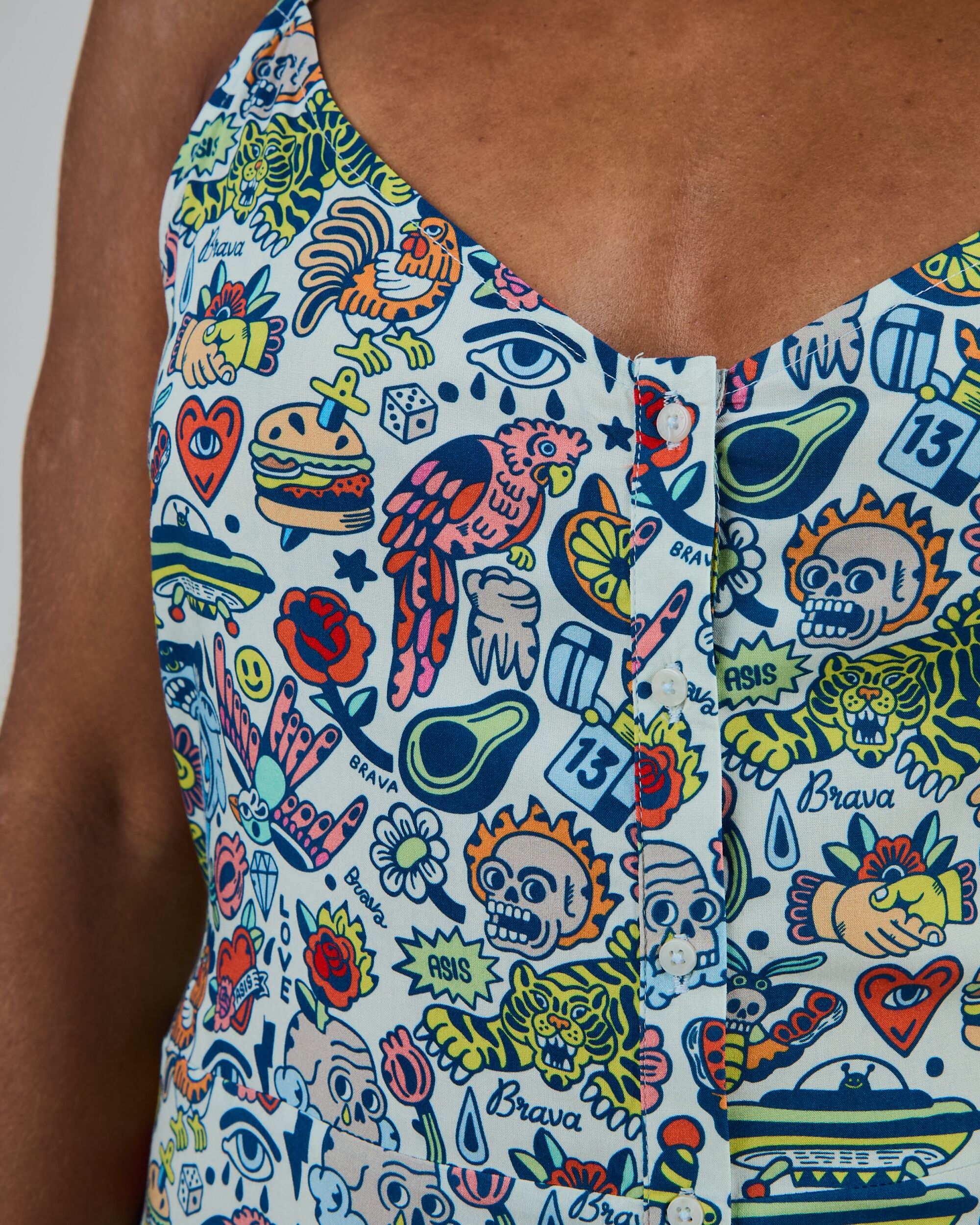La robe à bretelles THIS IS ASIS de Brava Fabrics marie audace et douceur avec son imprimé multicolore. Une pièce casual chic, pensée pour les journées ensoleillées et les soirées estivales, en coton bio ultra-doux.