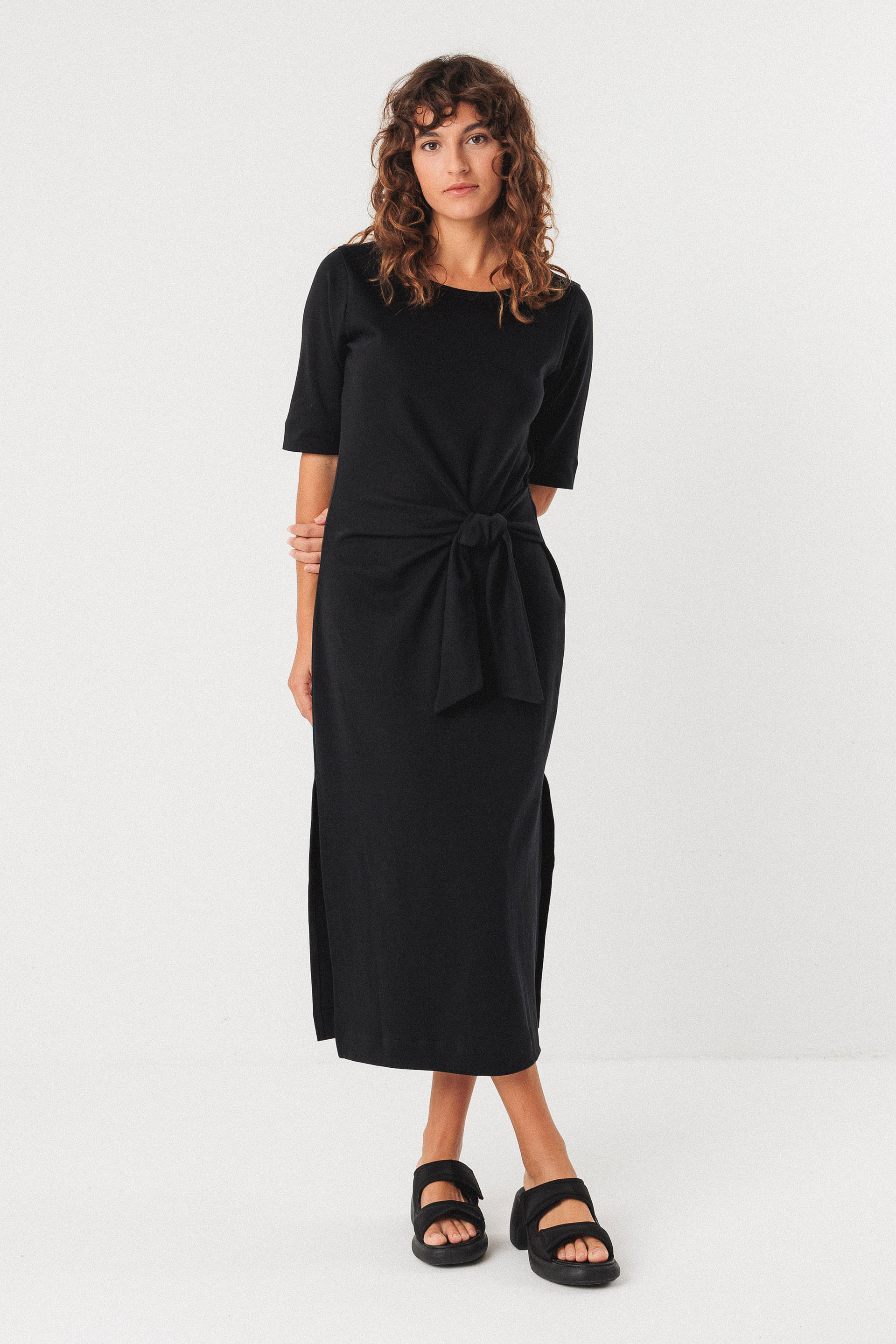 Robe mi longue ajustée avec un col bateau, des manches courtes et un détail noué sur l'avant. Elle s'enfile facilement et présente des fentes d'aisance sur les côtés en bas.