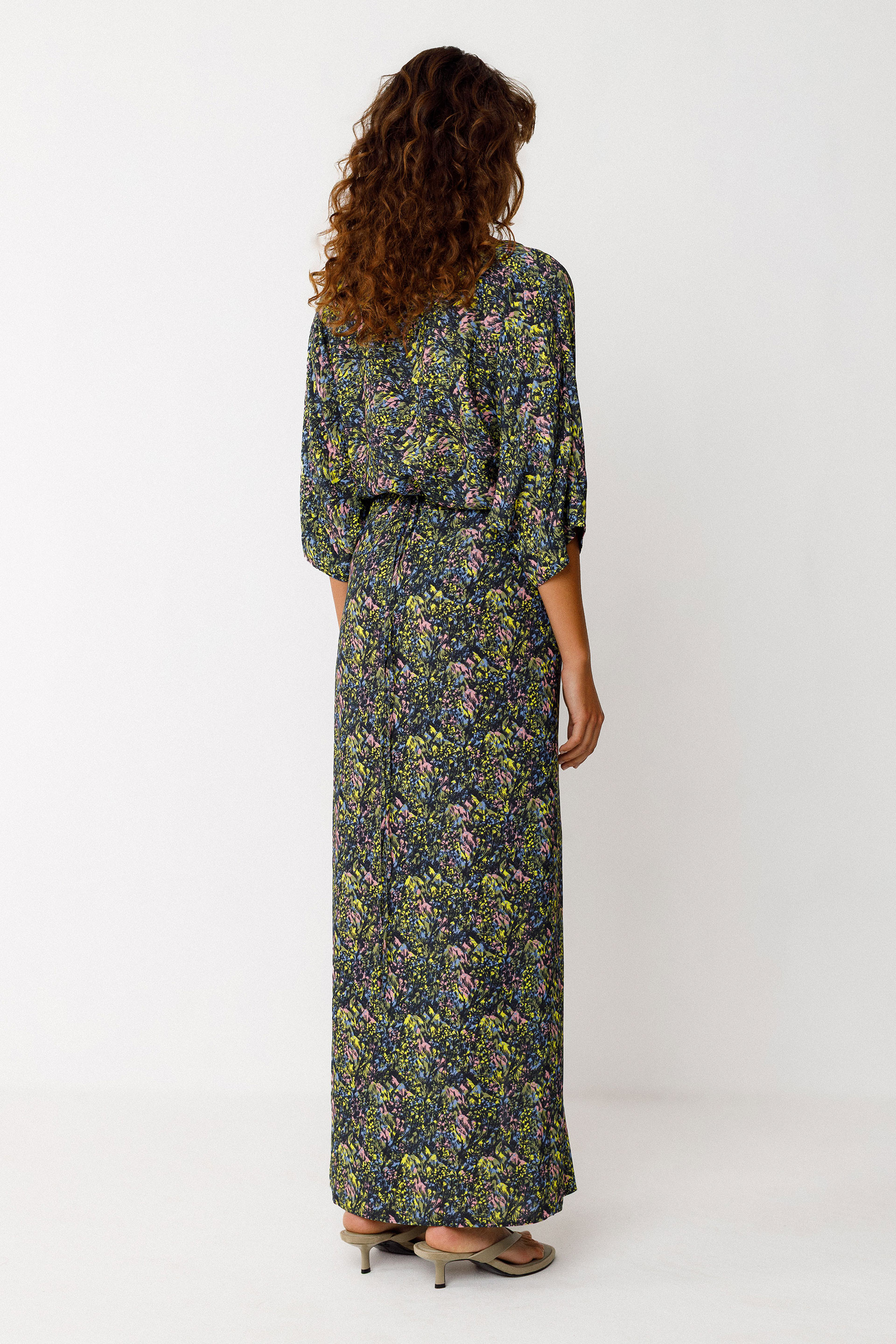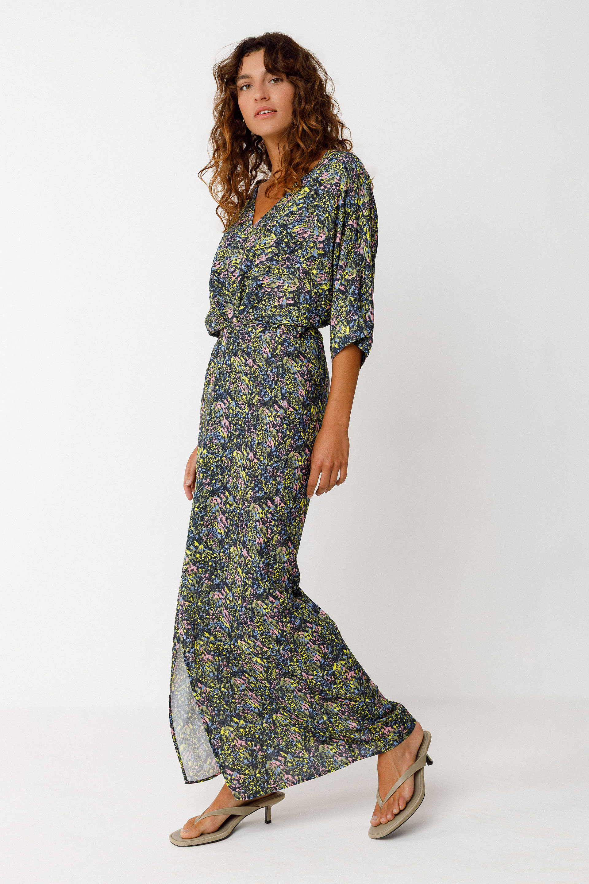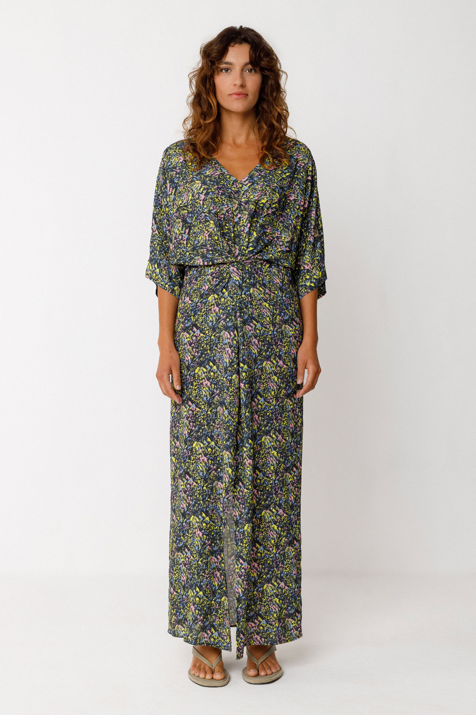 Longue robe à enfilage facile avec un col en V, des manches chauve-souris, une ceinture ajustable à la taille et une ouverture fendue devant.