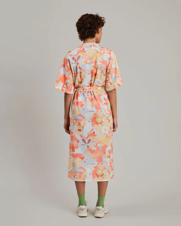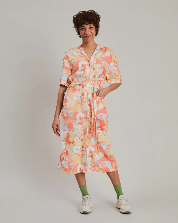 La robe-chemise orange Friends de Geco revisite la silhouette classique de la robe-chemise avec un imprimé audacieux. Confortable et polyvalente pour les journées d'été, les voyages et les week-ends, elle se porte boutonnée comme une robe ou ouverte comme une surchemise légère sur un t-shirt et un short.