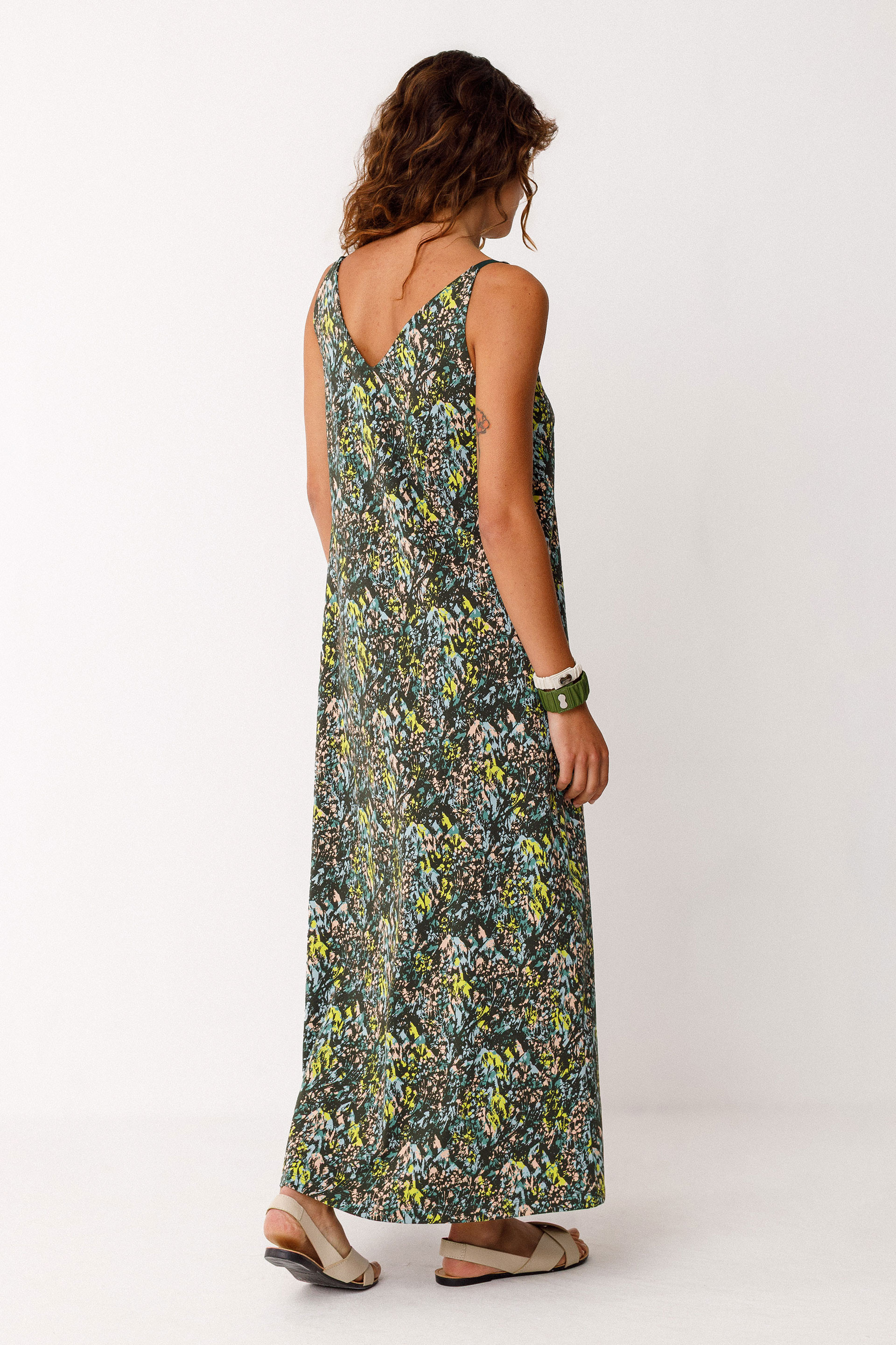 Robe mi-longue à bretelles présentant une coupe évasée et un col en V. Confectionnée en coton biologique certifié GOTS.