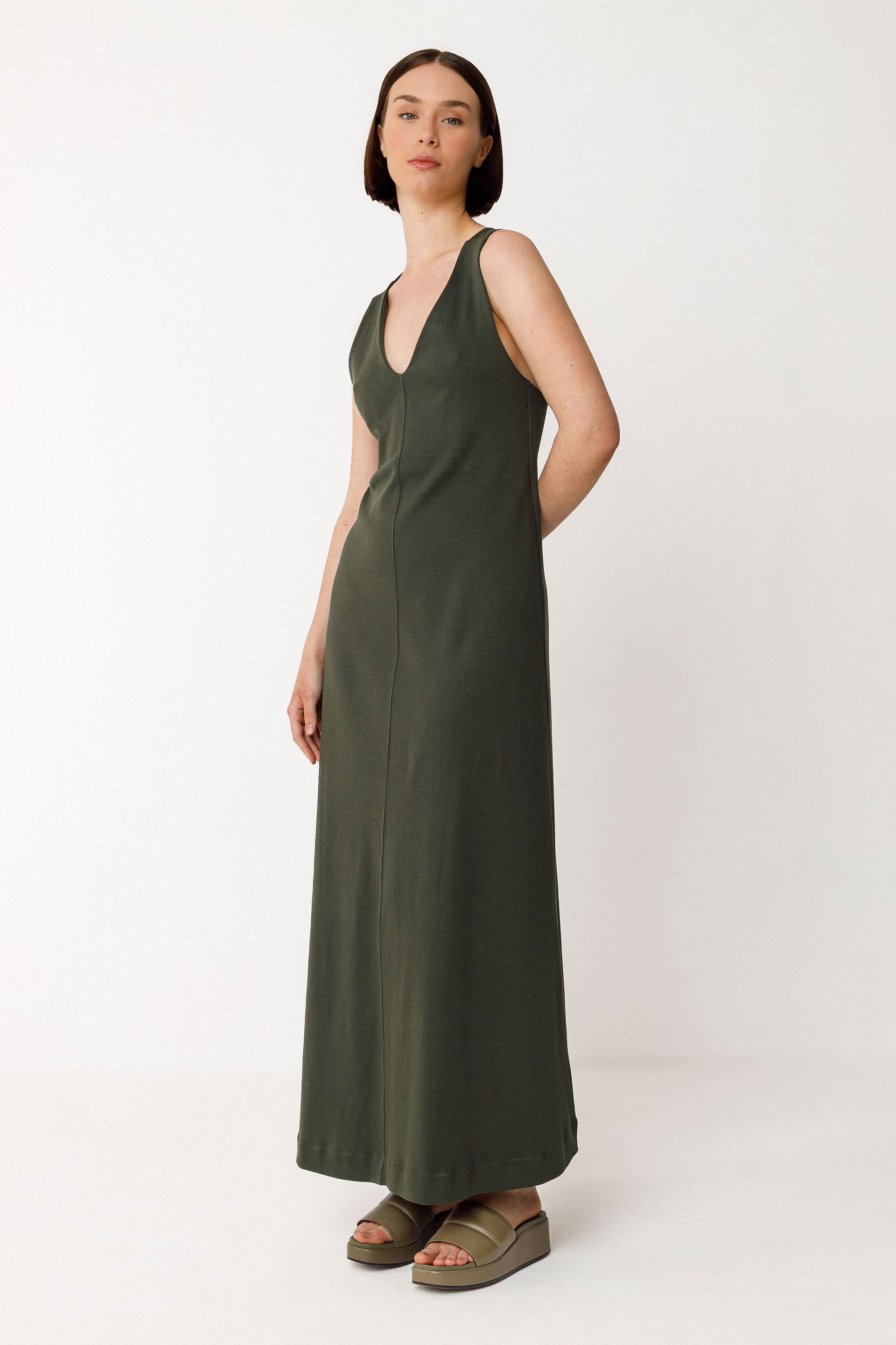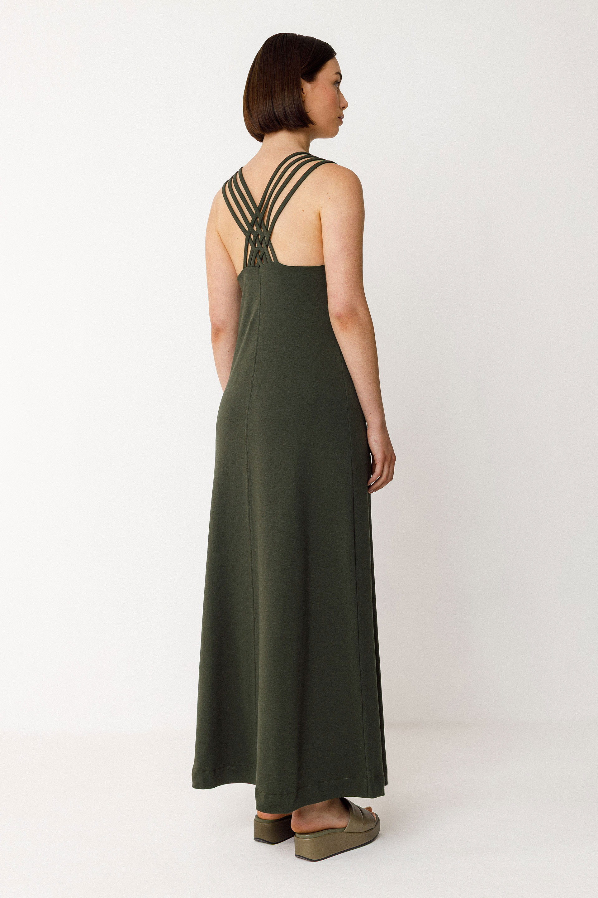 Robe sans manches mi-longue, avec une coupe évasée, un col en V et un jeu de bretelles dans le dos. Maille de coton biologique certifié GOTS.