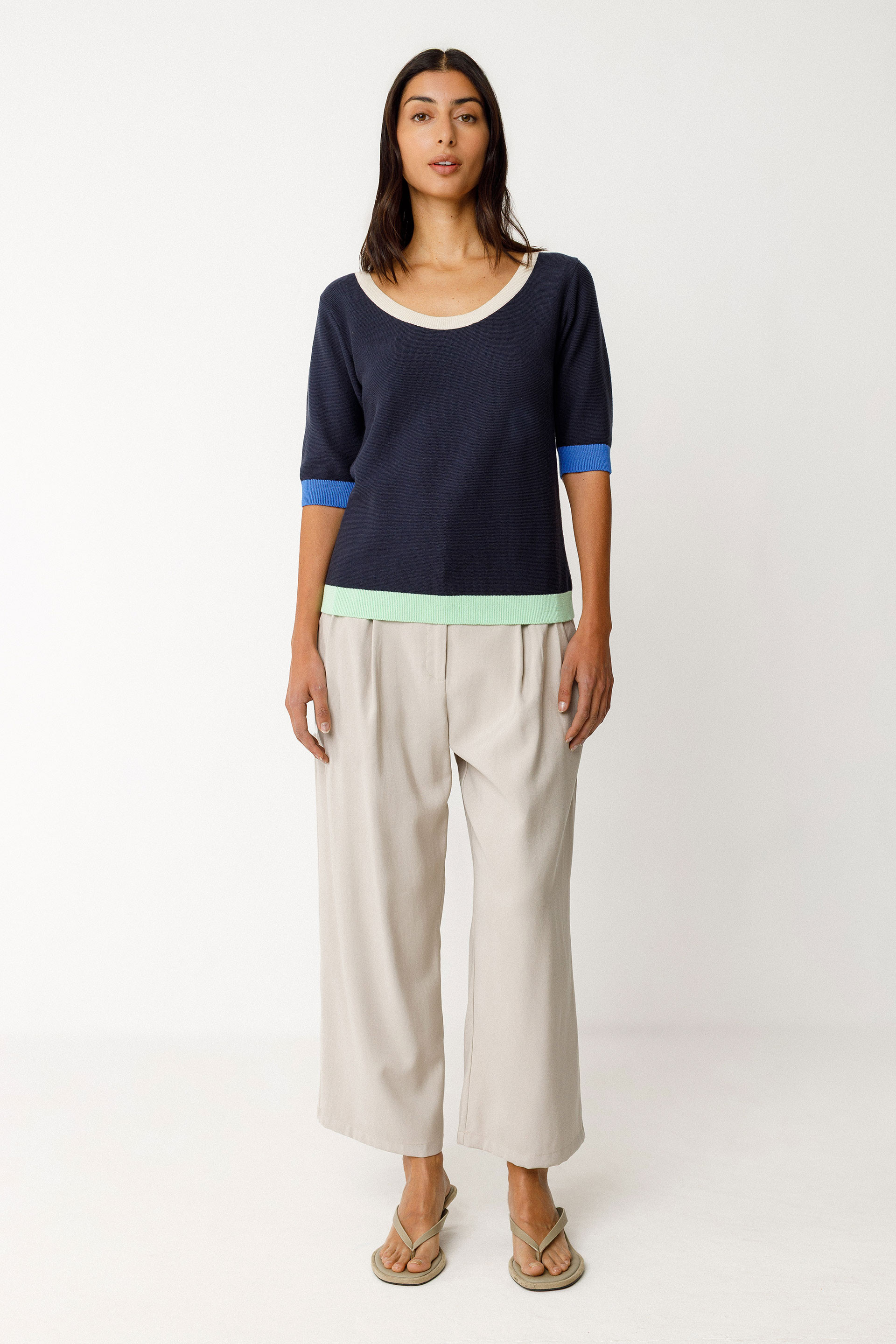 T-shirt à manches courtes en maille légère de coton biologique certifié GOTS, avec une coupe droite et une encolure arrondie.