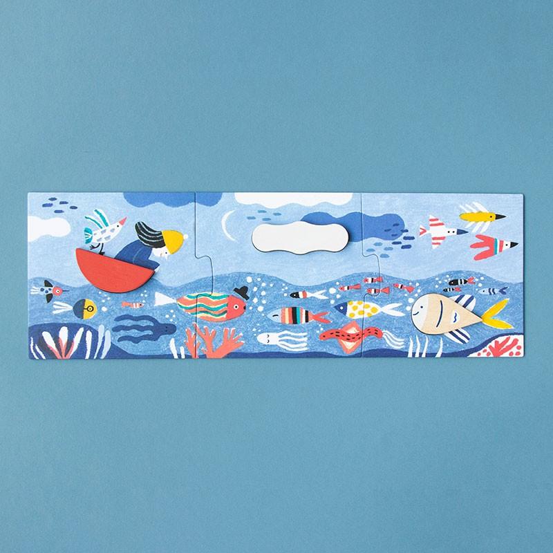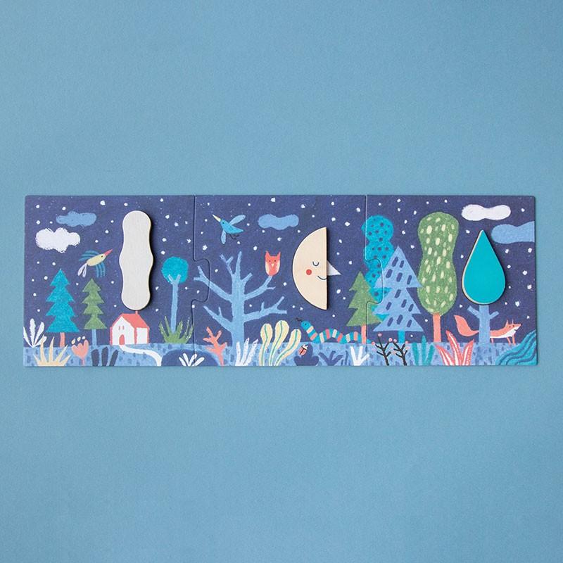 Est-ce la lune ou un bateau, un nuage ou une chenille, un poisson ou une goutte d'eau ? Un jeu pour l'imagination ! Assemblez les puzzles et insérez les pièces en bois. 4 puzzles de 3 grandes pièces avec chacun 3 pièces en bois qui changent de signification en fonction de l'illustration dans laquelle elles s'insèrent. Illustration : Queralt Armengol Âge : À partir de 2 ans Nombre de pièces : 12 en carton et 3 en bois Matériau : Papier FSC, carton recyclé et bois Packaging : Boîte en carton rigide Mesures Boîte : 19 x 18,5 x 4,5 cm Fabriqué à Barcelone